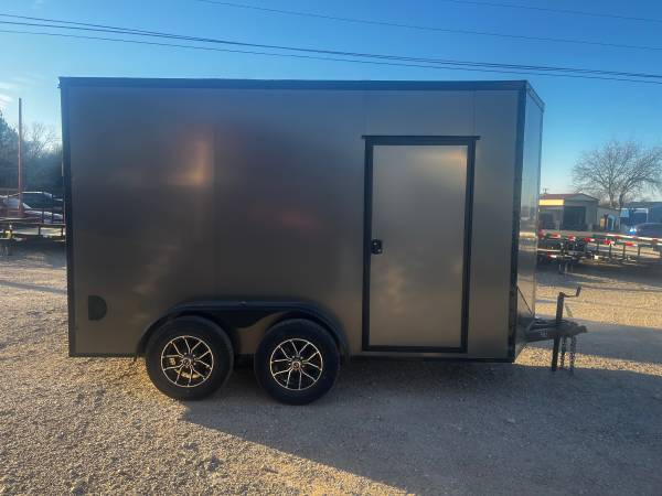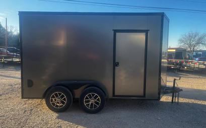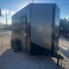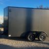 New 2026 6'x12' & 7' tall Screwless Polycore exterior Enclosed cargo trailer, 2-3500# axles with electric brake on rear, rear ramp rated at 3500#'s, mag aluminum wheels, vnose, 3/4" floor plywood on 16" centers, 3/8" wall on 16" centers, charcoal grey.