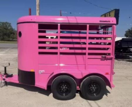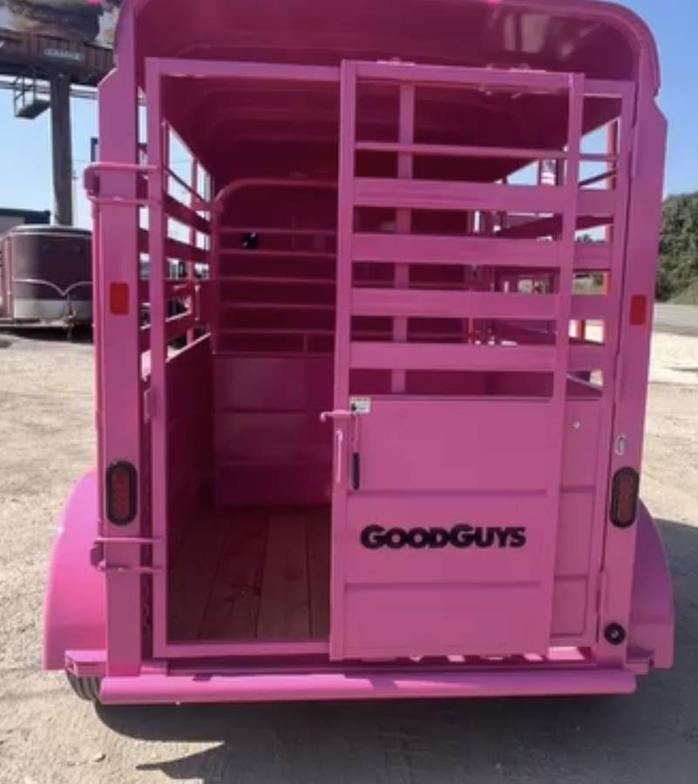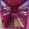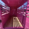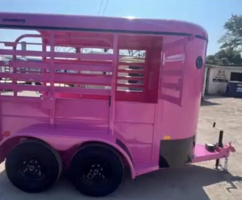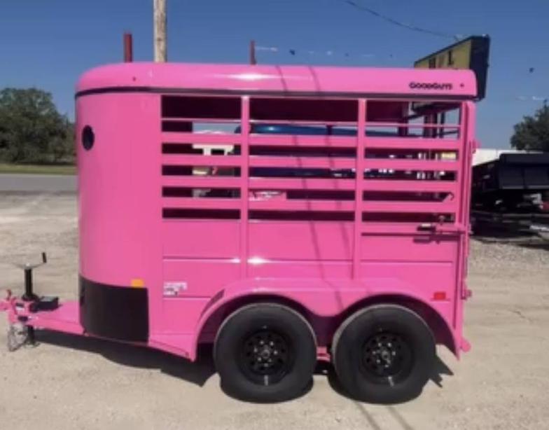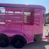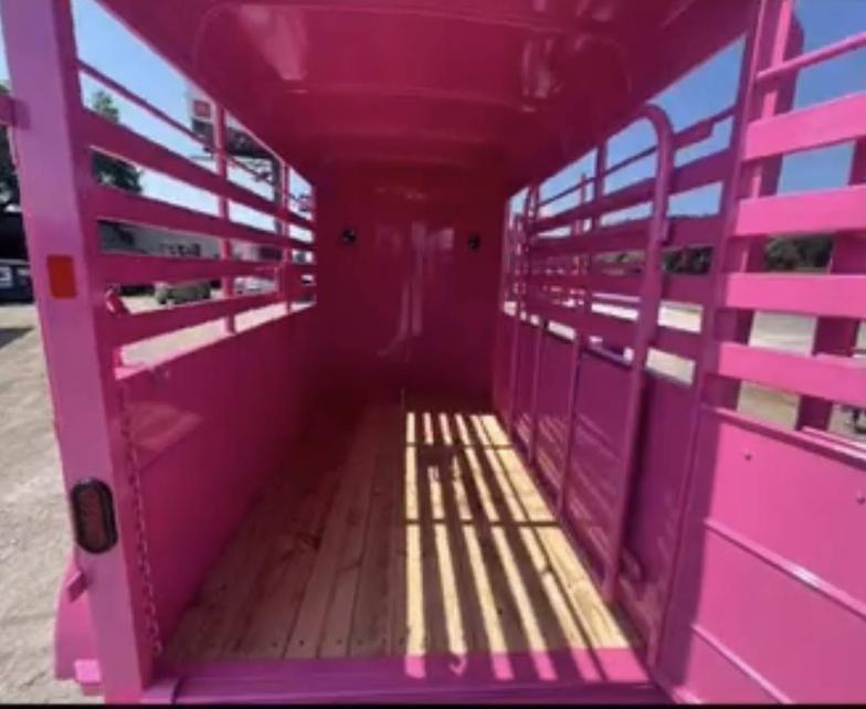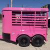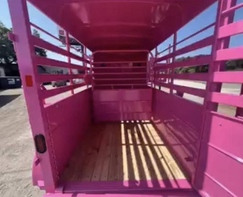 SALE on this New 2026 Malibu Pink 5’x10’ Rancher stock trailer 6’6” tall, 2-3500# electric brake axles, full swing half slide rear gate, half access door, divider gate up by access door, spare rack, (spare extra if needed)