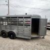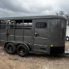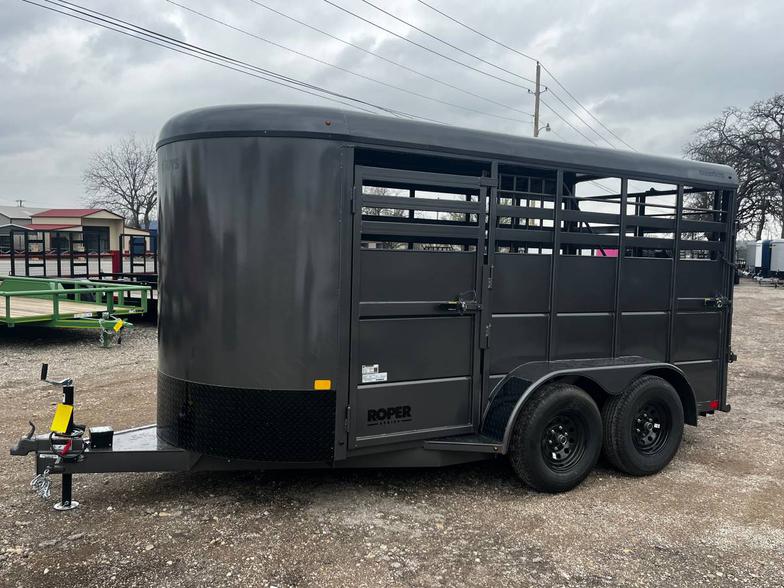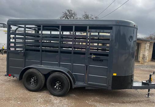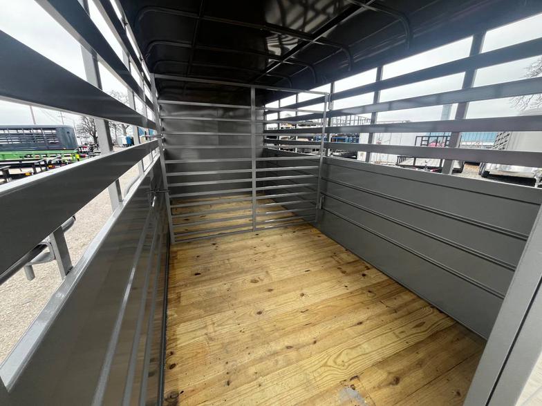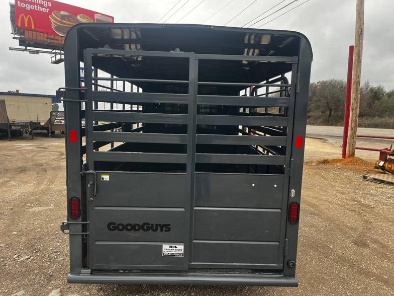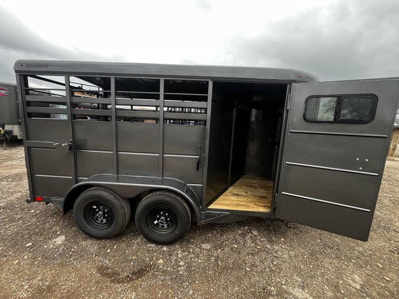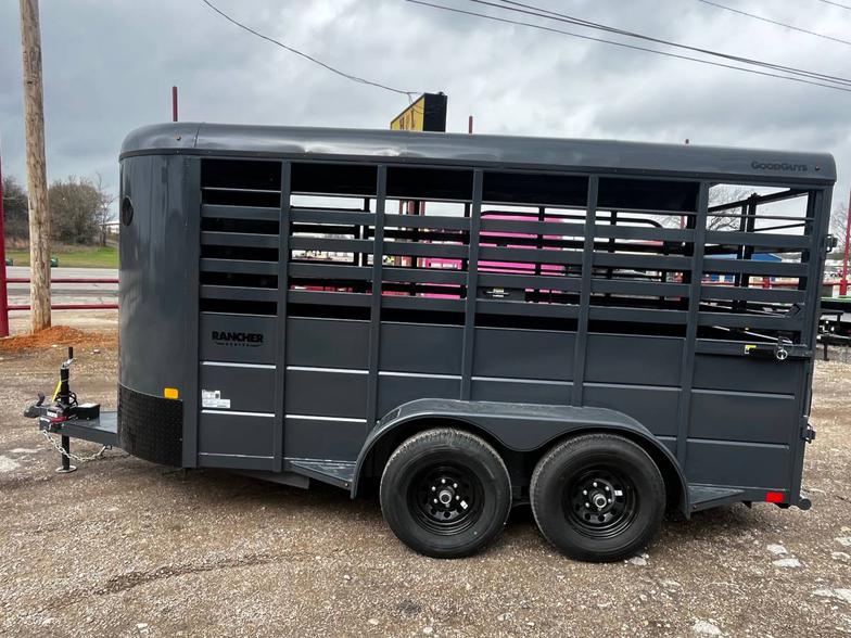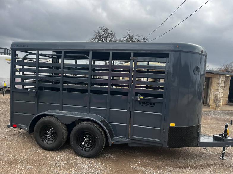 Brand New 2026 Goodguys Rancher livestock trailer ready to roll. 6’x14’ & 6’6” tall, 2-5200# axles with brakes, treated floor, side access door, full swing half slide rear gate, treated floor, slat sides, circle vents, black out package on trim, chrome, wheels, spare rack (spare additional if needed) 2 5/16” demco coupler. Industrial charcoal grey in color