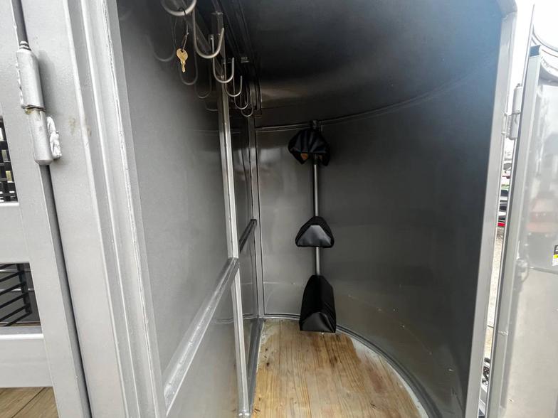 WW 6’x16’ & 6’6” tall, includes a 3’ nose storage compartment with 3-tier removable saddle racks and bridle hooks with walk in door, roughly 13' stall area, with divider gate centered, full swing half slide rear gate, side access door, spare rack (spare additional if need) 2-5200# electric torsion brake axles, treated floor, Pewter in color.